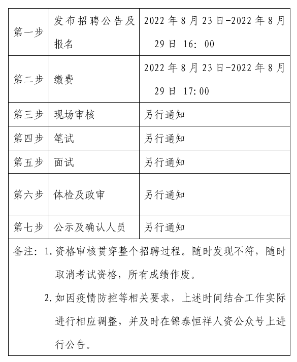 (二)体检时间、地点及注意事项在“锦泰恒祥人资公众号”进行通知。